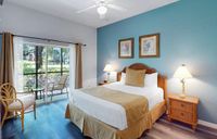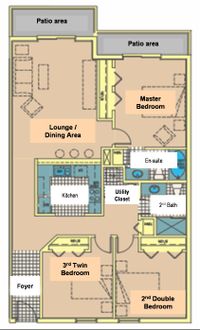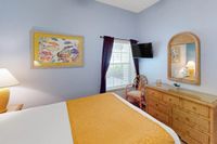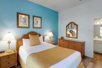 The master bedroom is spacious with a queen size bed, lots of wardrobe hanging space, large double chest, bedside cabinets and a wall mounted cable TV. Sliding doors open to a second mesh screen patio area.