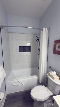 The master ensuite bathroom comprises a small bath with electric shower, large basin and toilet. A hairdryer is provided and there is a small linen cupboard, additional linen and towels can be requested from housekeeping.